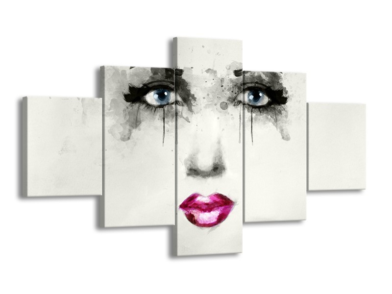 Canvas Schilderij Vrouw, Gezicht | Zwart, Roze, Crème | 125x70cm 5Luik