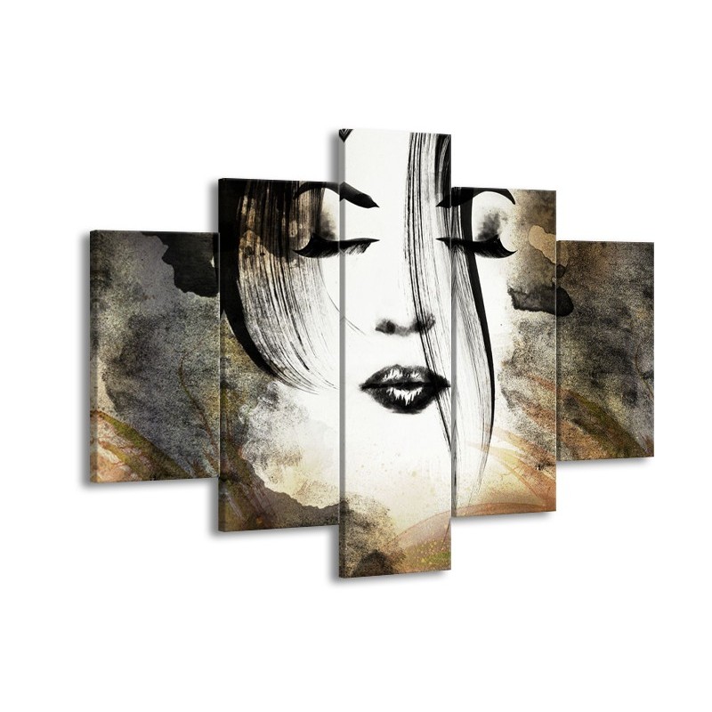 Canvas Schilderij Vrouw, Gezicht | Zwart, Wit, Bruin | 150x105cm 5Luik