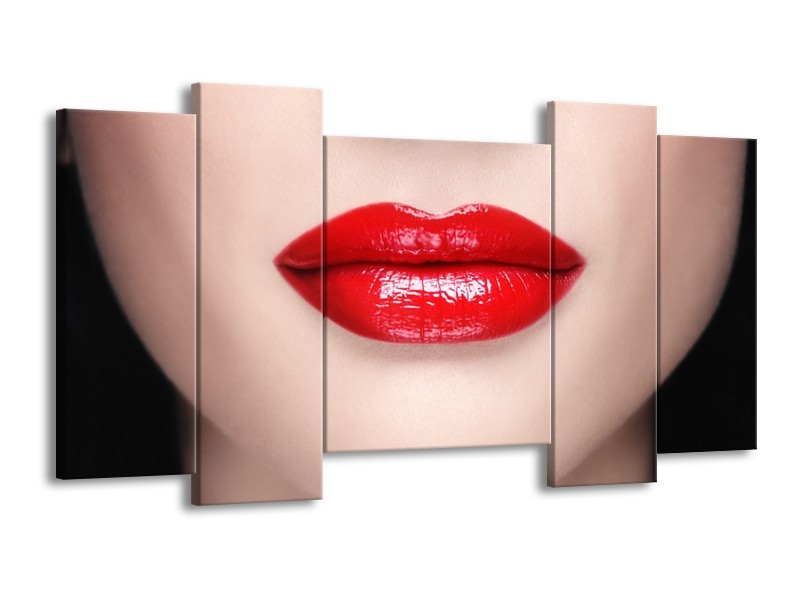 Canvas Schilderij Vrouw, Lippen | Rood, Crème | 120x65cm 5Luik
