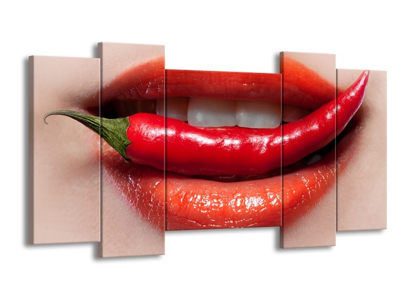 Canvas Schilderij Vrouw, Lippen | Rood, Crème | 120x65cm 5Luik