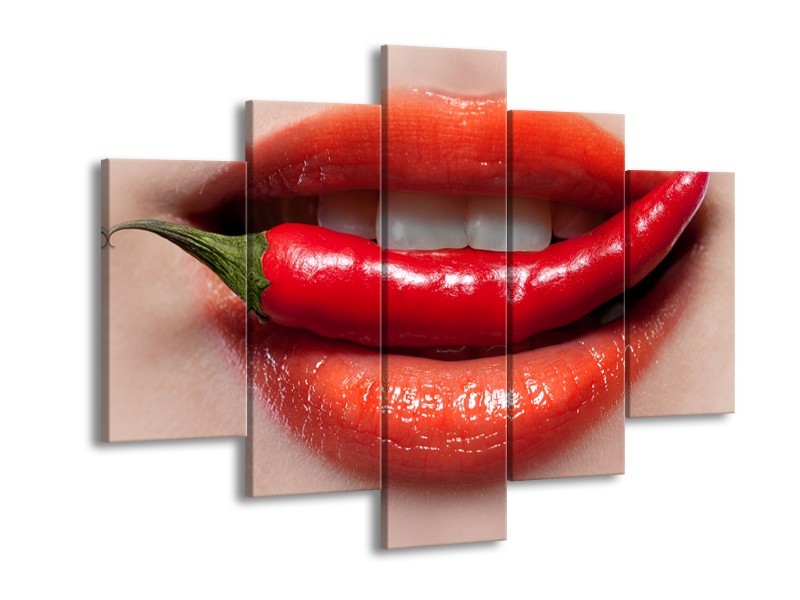 Canvas Schilderij Vrouw, Lippen | Rood, Crème | 150x105cm 5Luik
