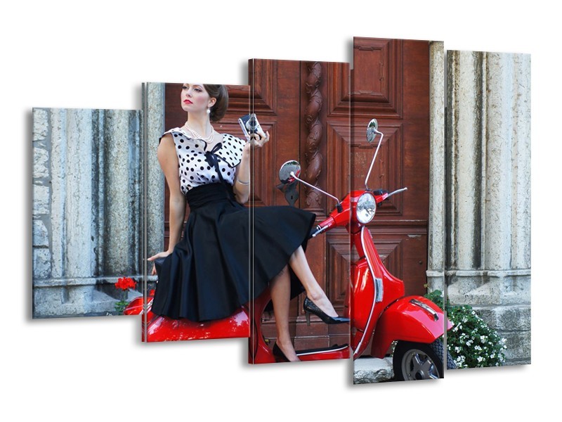 Canvas Schilderij Vrouw, Scooter | Rood, Zwart, Bruin | 150x100cm 5Luik