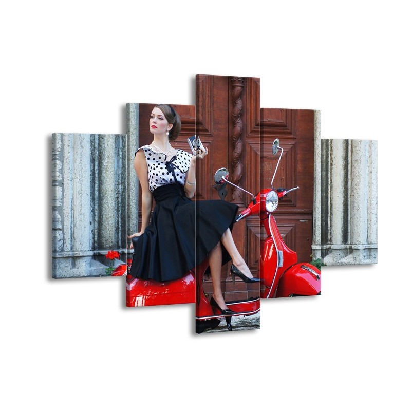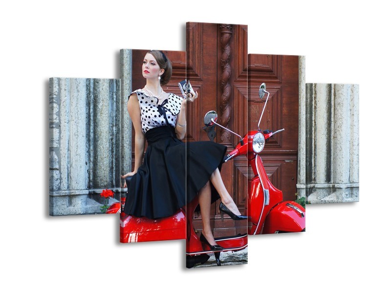 Canvas Schilderij Vrouw, Scooter | Rood, Zwart, Bruin | 150x105cm 5Luik
