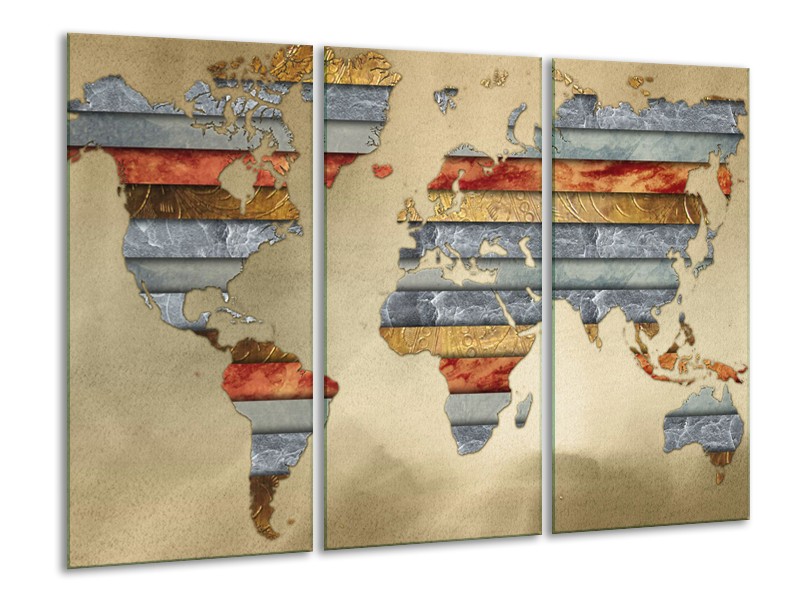 Canvas Schilderij Wereldkaart | Grijs, Crème, Bruin | 120x80cm 3Luik