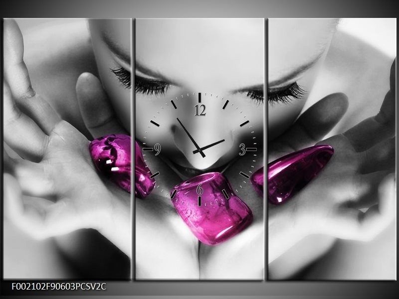 Klok schilderij Gezicht | Zwart, Grijs, Paars | 90x60cm 3Luik