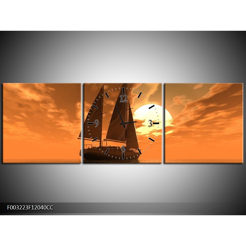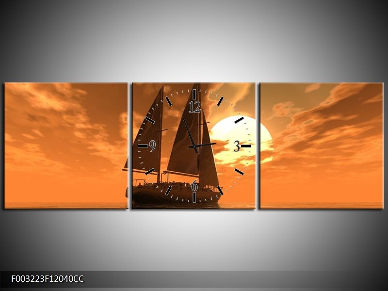 Klok schilderij Zeilboot | Bruin, Geel, Grijs | 120x40cm 3Luik