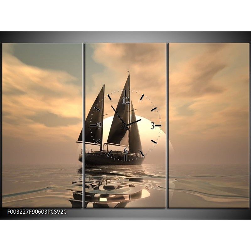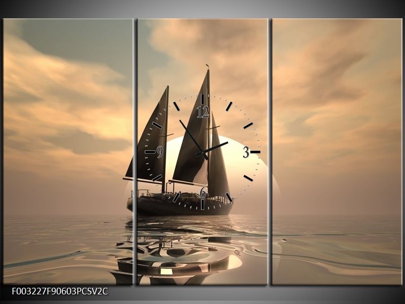 Klok schilderij Zeilboot | Wit, Grijs, Bruin | 90x60cm 3Luik