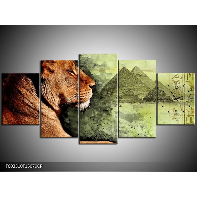 Klok schilderij Leeuw | Bruin, Grijs, Groen | 150x70cm 5Luik