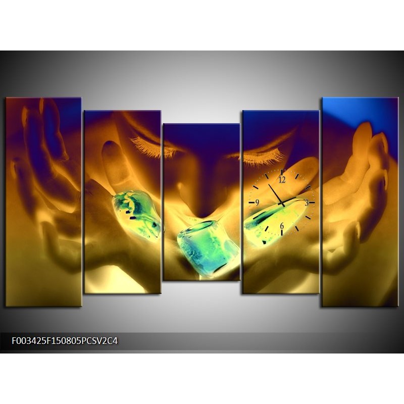 Klok schilderij Gezicht | Groen, Geel, Blauw | 150x80cm 5Luik