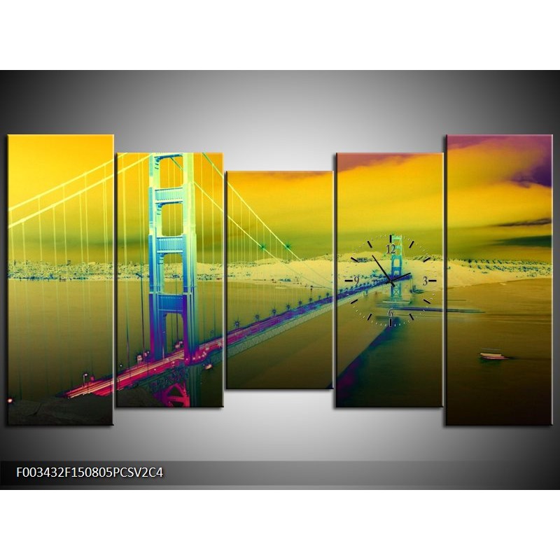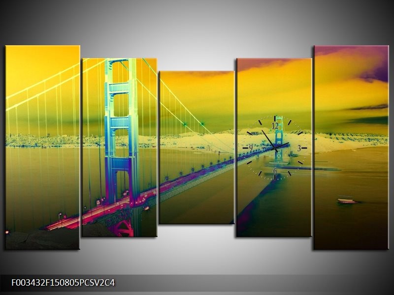 Klok schilderij Brug | Groen, Geel, Paars | 150x80cm 5Luik