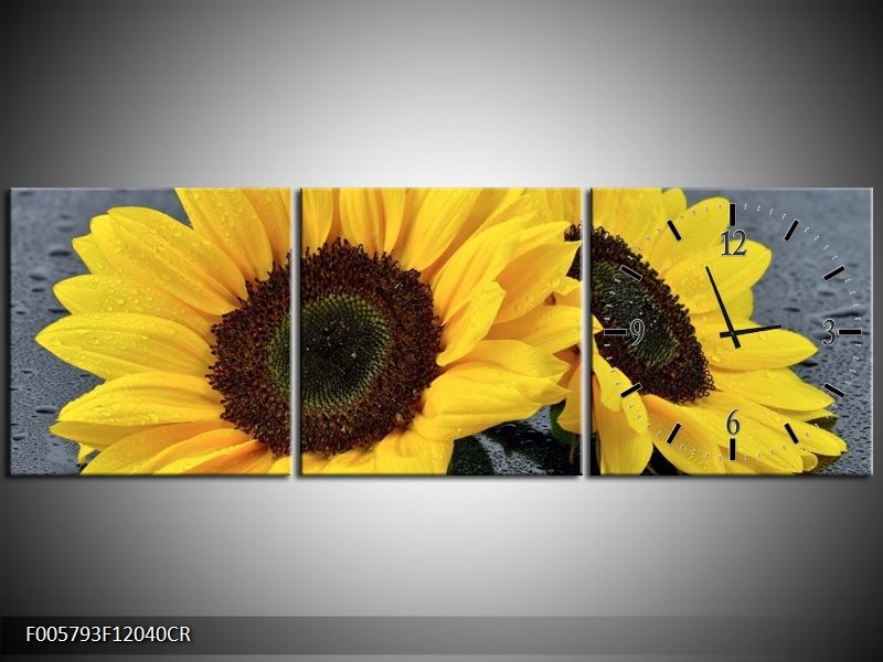 Klok schilderij Zonnebloem | Geel, Zwart | 120x40cm 3Luik
