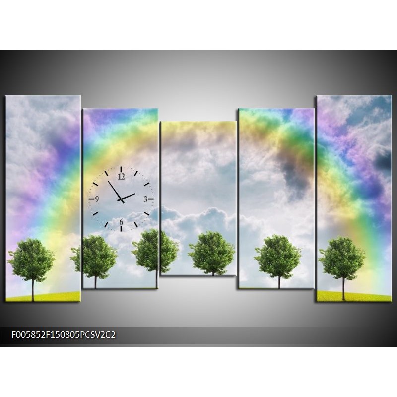 Klok schilderij Bomen | Groen, Grijs, Paars | 150x80cm 5Luik