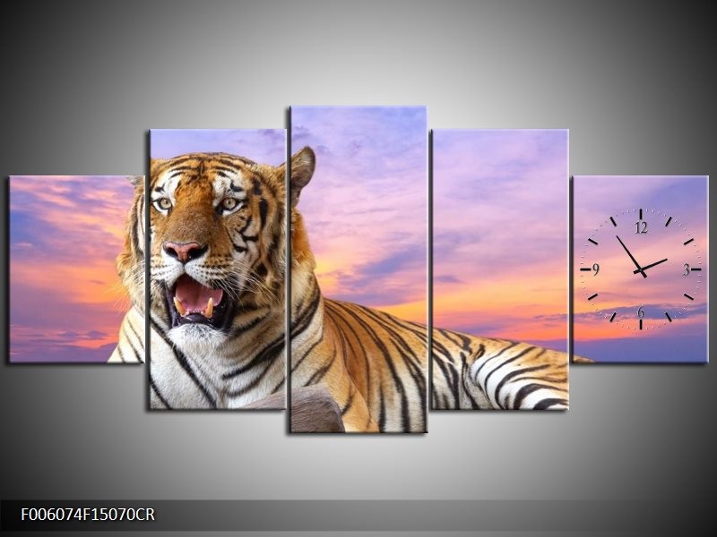 Klok schilderij Tijger | Bruin, Wit, Blauw | 150x70cm 5Luik
