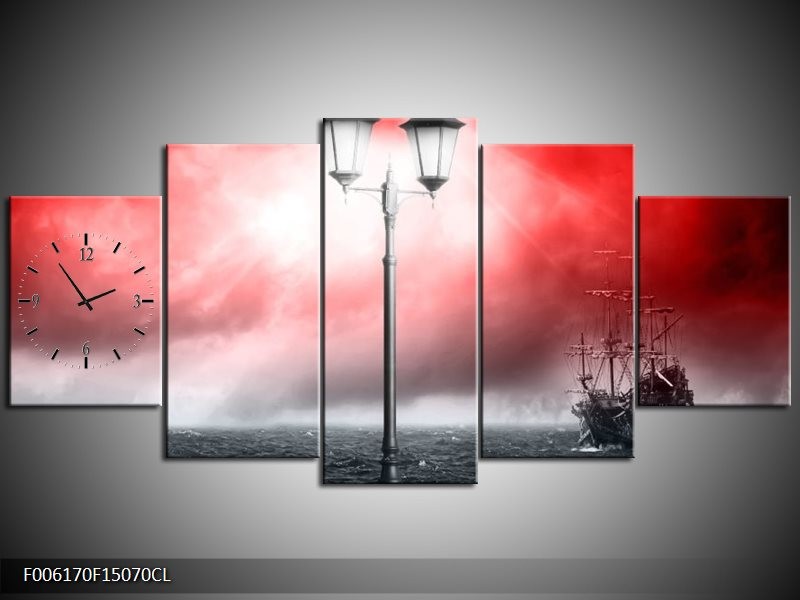 Klok schilderij Zee | Rood, Grijs, Zwart | 150x70cm 5Luik