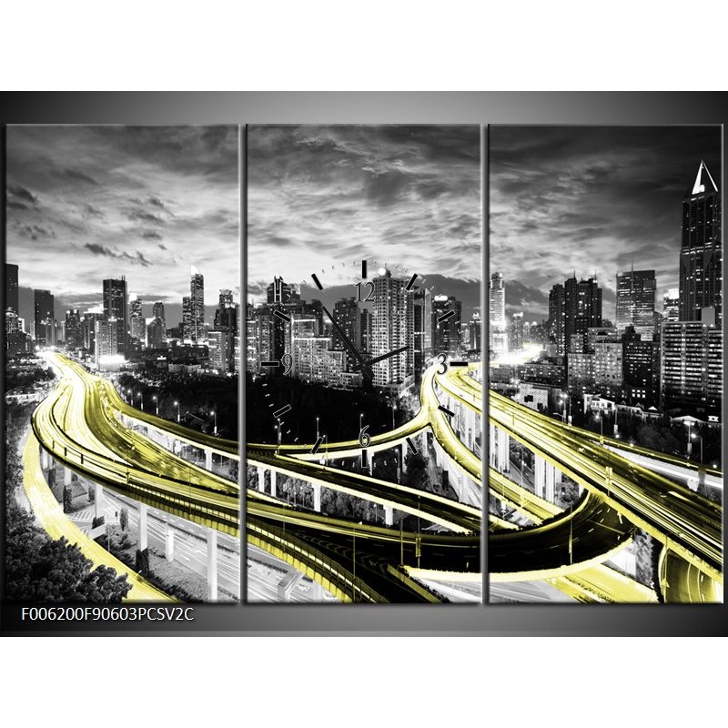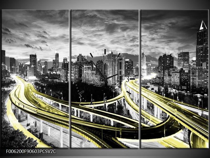 Klok schilderij Wolkenkrabber | Geel, Goud, Grijs | 90x60cm 3Luik