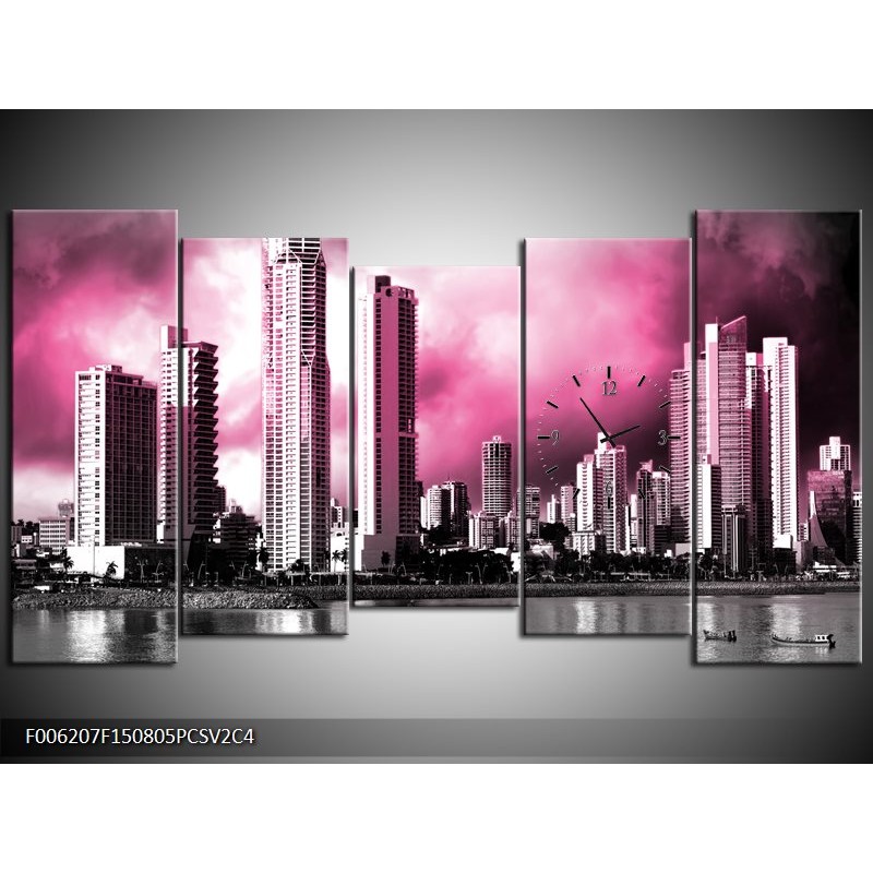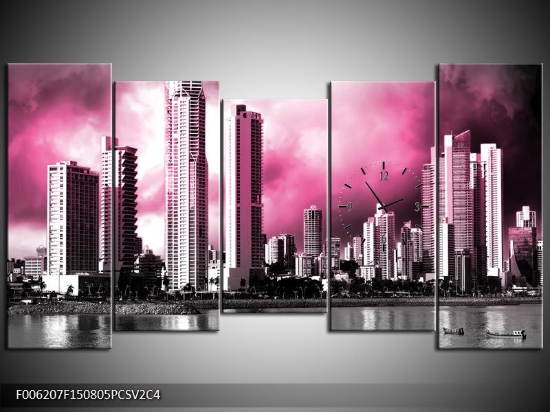 Klok schilderij Wolkenkrabber | Roze, Grijs | 150x80cm 5Luik