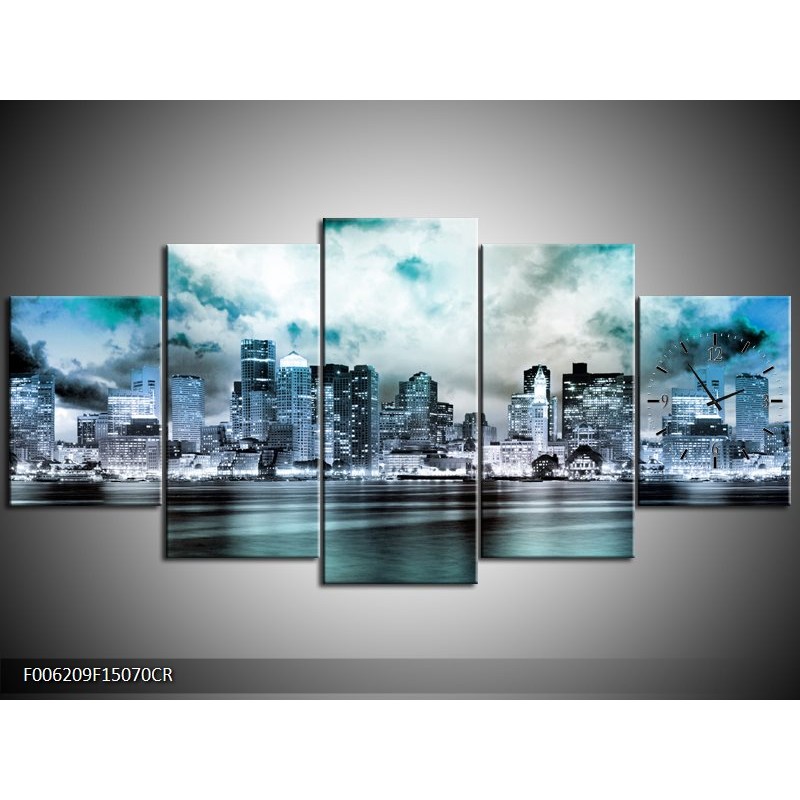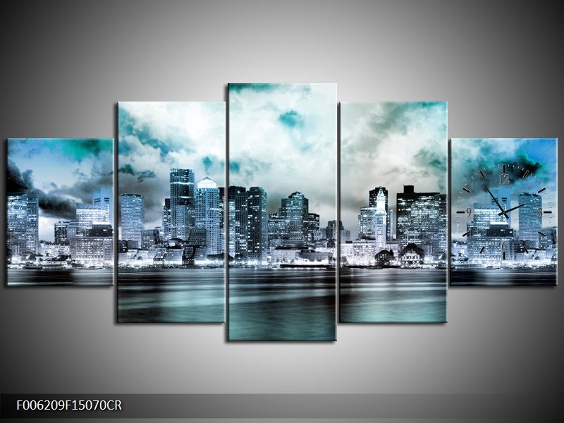 Klok schilderij Wolkenkrabber | Groen, Blauw | 150x70cm 5Luik