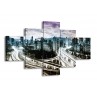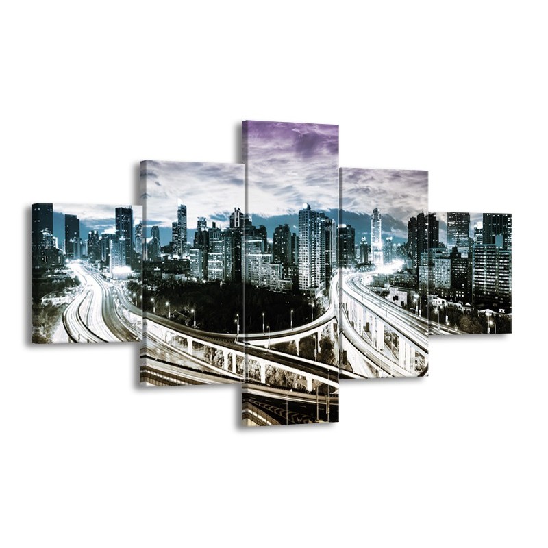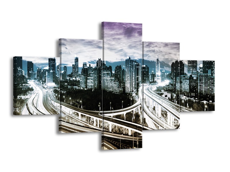 Canvas schilderij Wolkenkrabber | Paars, Blauw, Geel | 125x70cm 5Luik