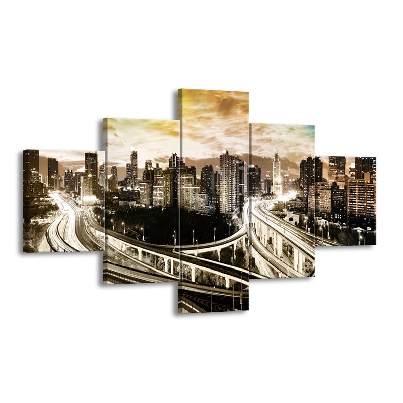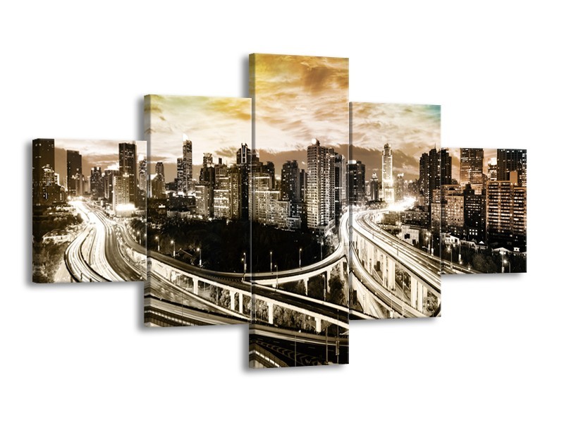 Canvas schilderij Wolkenkrabber | Geel, Blauw, Sepia | 125x70cm 5Luik