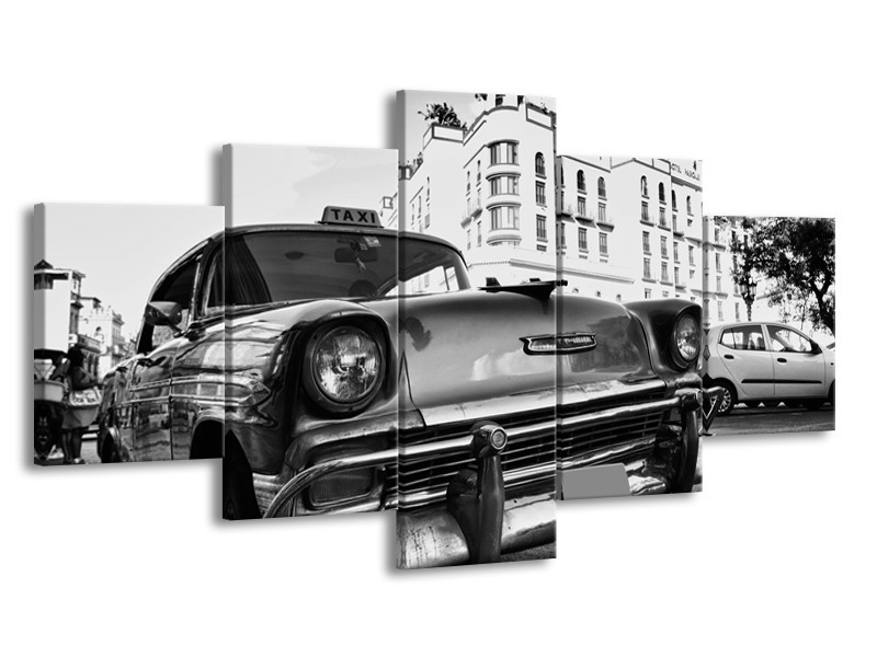 Glasschilderij Auto, Oldtimer | Zwart, Grijs, Wit | 150x80cm 5Luik