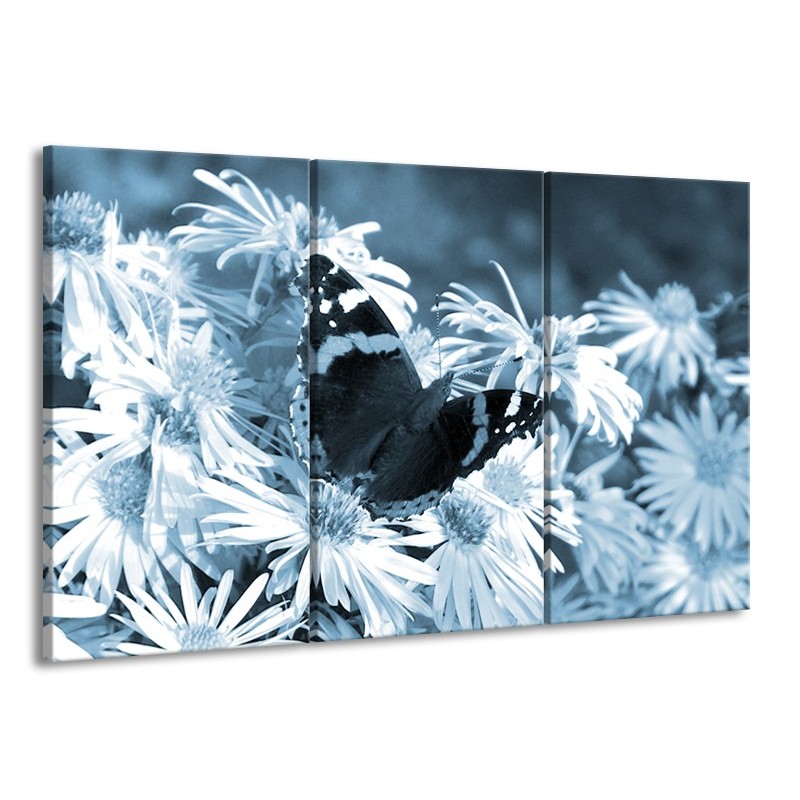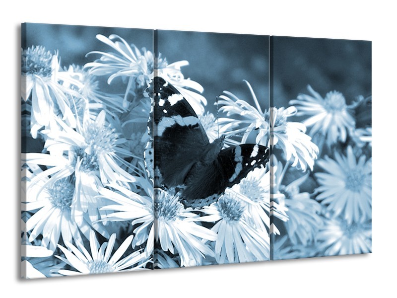 Glasschilderij Bloemen, Vlinder | Blauw, Grijs, Zwart | 165x100cm 3Luik