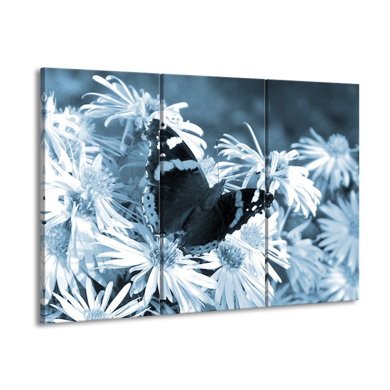 Glasschilderij Bloemen, Vlinder | Blauw, Grijs, Zwart | 60x90cm 3Luik