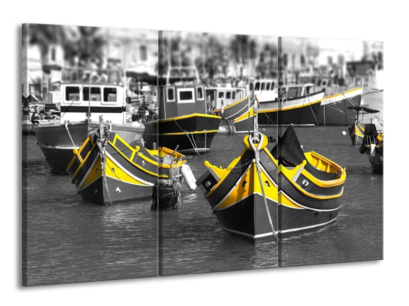 Glasschilderij Boot, Water | Zwart, Wit, Geel | 165x100cm 3Luik