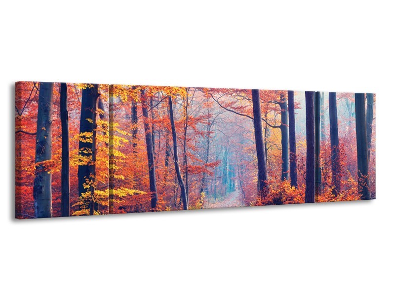 Glasschilderij Bos, Herfst | Oranje, Bruin, Grijs | 170x50cm 3Luik
