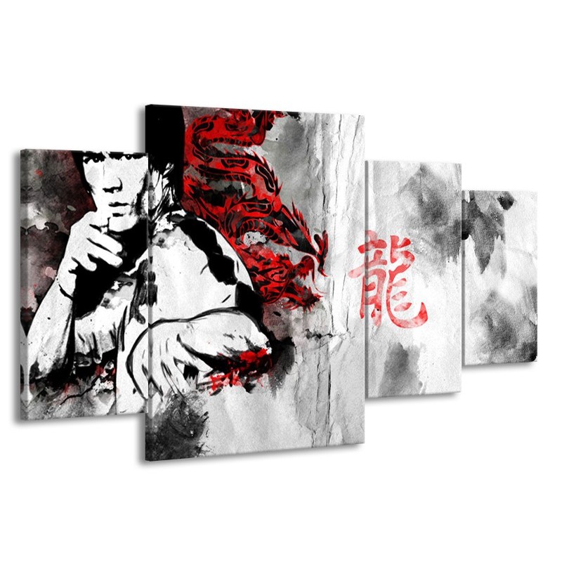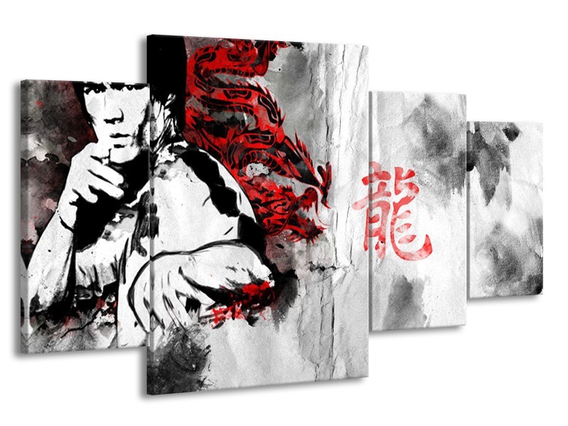 Glasschilderij Bruce Lee, Sport | Zwart, Wit, Rood | 160x90cm 4Luik