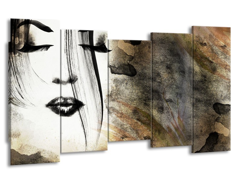 Glasschilderij Gezicht, Vrouw | Zwart, Bruin, Wit | 150x80cm 5Luik