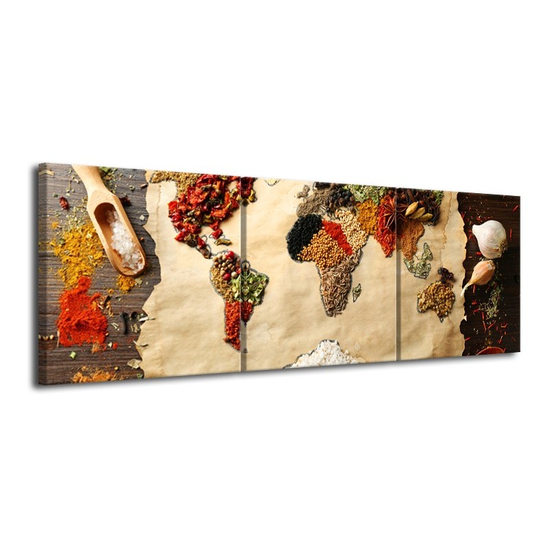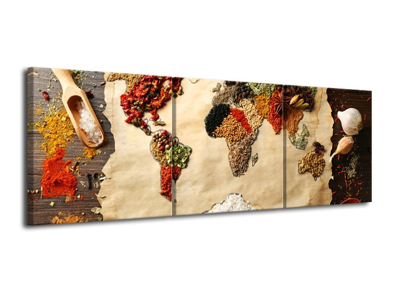 Glasschilderij Kruiden, Wereldkaart | Bruin, Crème | 120x40cm 3Luik