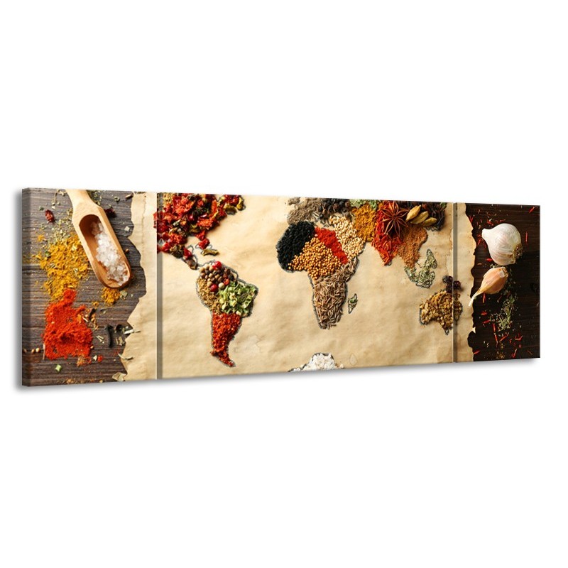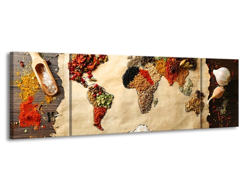 Glasschilderij Kruiden, Wereldkaart | Bruin, Crème | 170x50cm 3Luik
