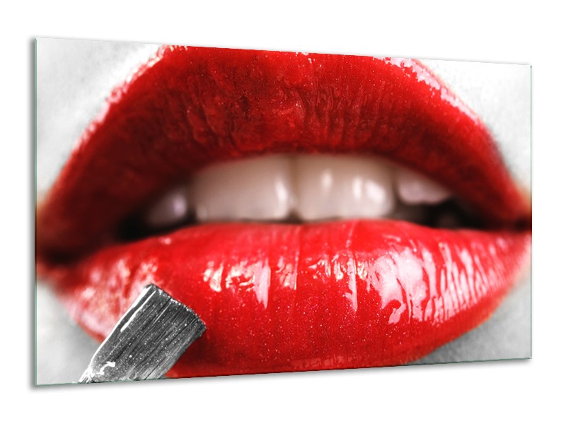 Glasschilderij Lippen, Vrouw | Grijs, Rood | 120x70cm 1Luik