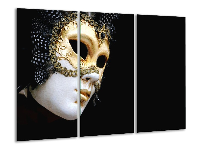Glasschilderij Masker, Modern | Zwart, Wit, Goud | 120x80cm 3Luik
