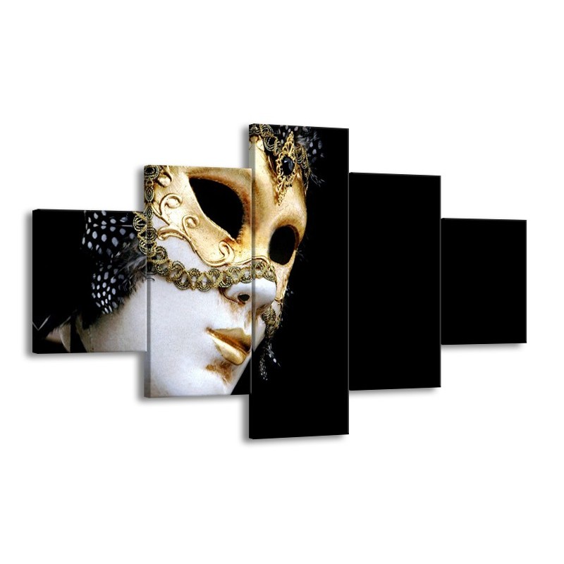 Glasschilderij Masker, Modern | Zwart, Wit, Goud | 125x70cm 5Luik
