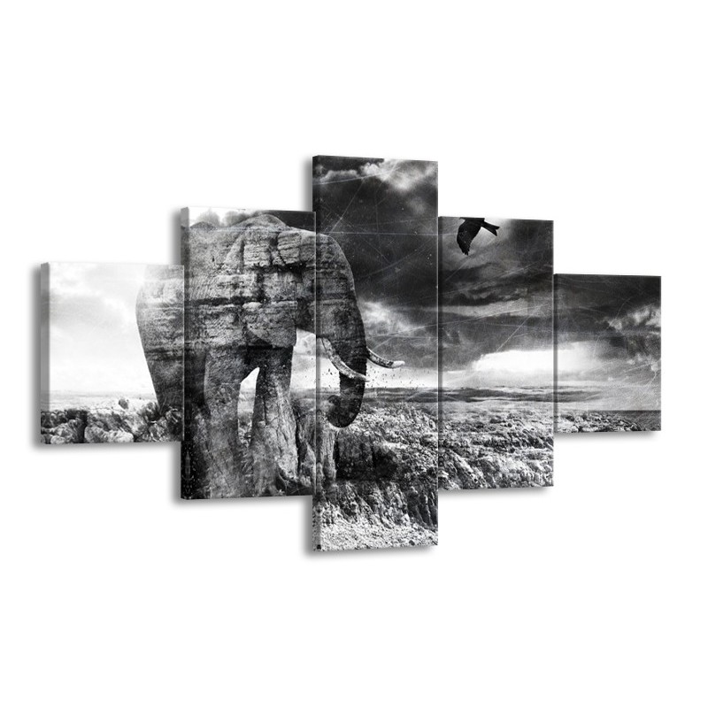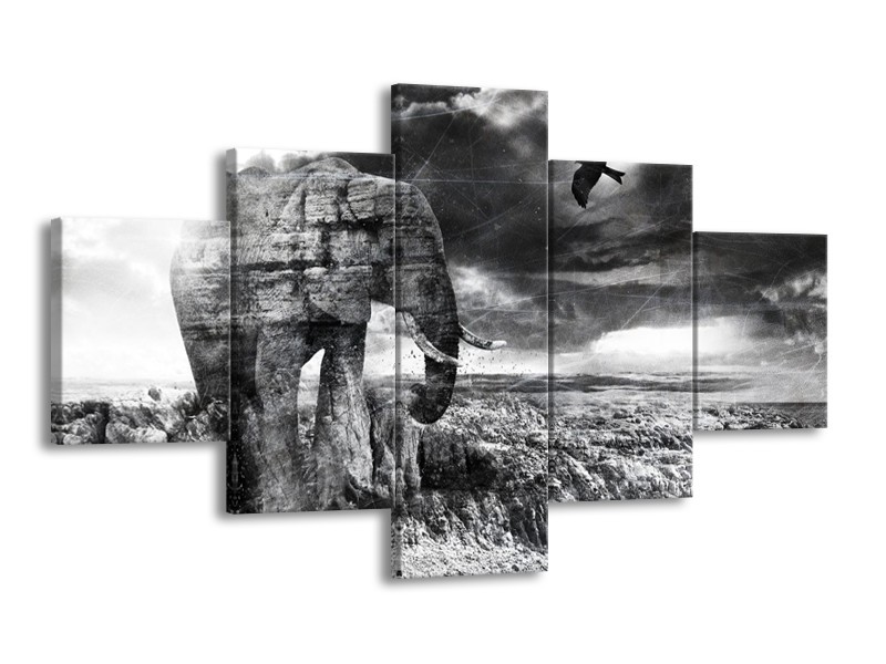 Glasschilderij Modern, Olifant | Zwart, Wit, Grijs | 125x70cm 5Luik