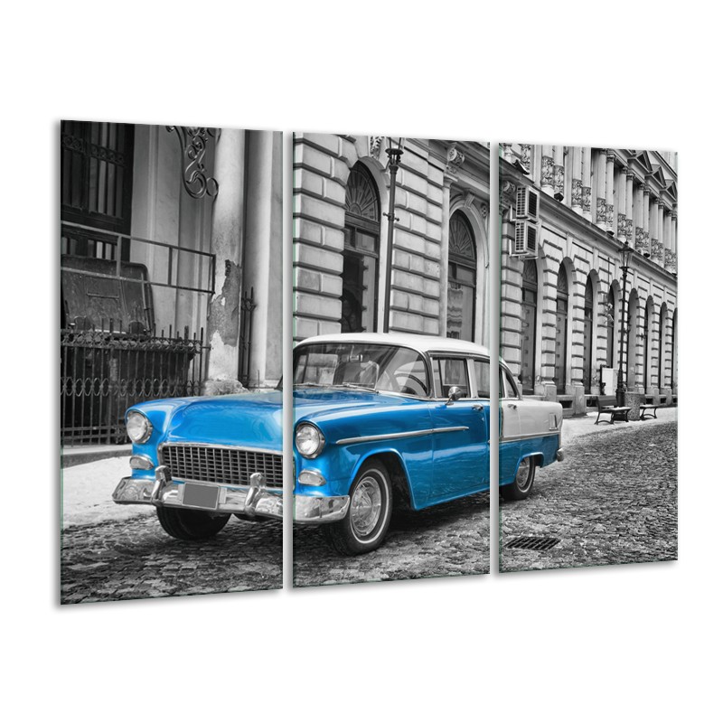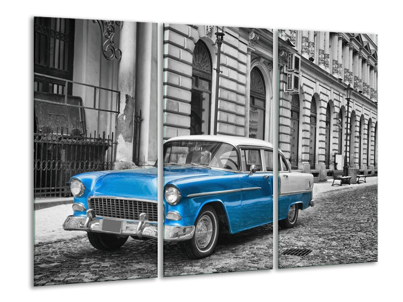 Glasschilderij Oldtimer, Auto | Grijs, Blauw, Zwart | 120x80cm 3Luik