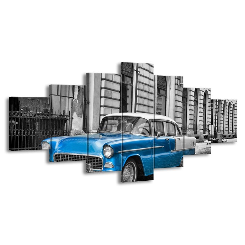 Glasschilderij Oldtimer, Auto | Grijs, Blauw, Zwart | 210x100cm 7Luik