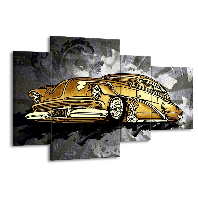 Glasschilderij Oldtimer, Auto | Grijs, Geel, Goud | 120x75cm 4Luik