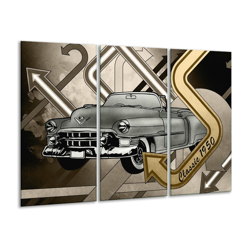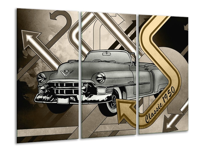 Glasschilderij Oldtimer, Auto | Grijs, Goud | 120x80cm 3Luik