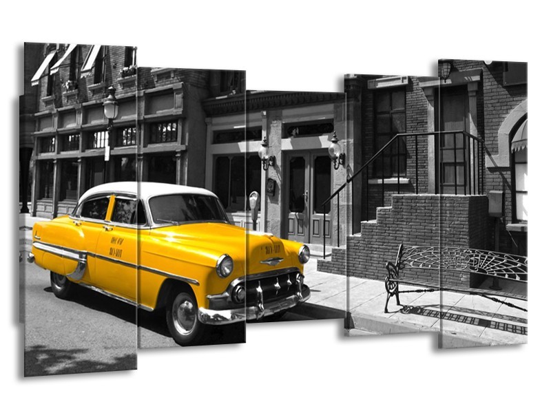 Glasschilderij Oldtimer, Auto | Zwart, Wit, Geel | 150x80cm 5Luik