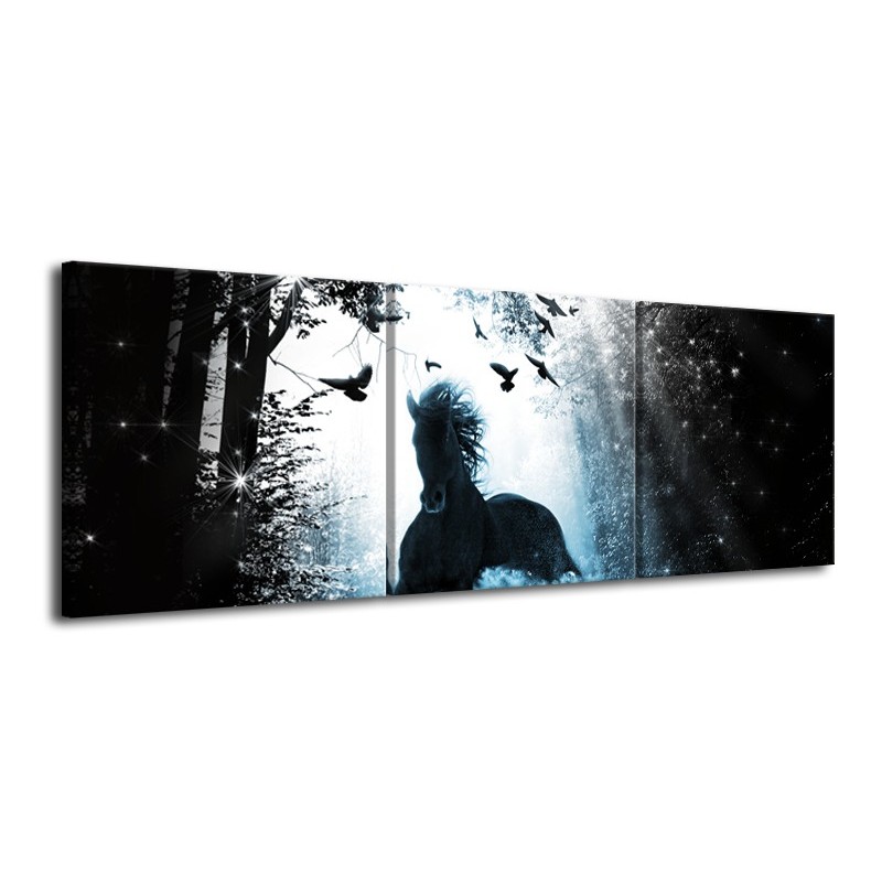 Glasschilderij Paard, Dieren | Blauw, Zwart, Wit | 120x40cm 3Luik
