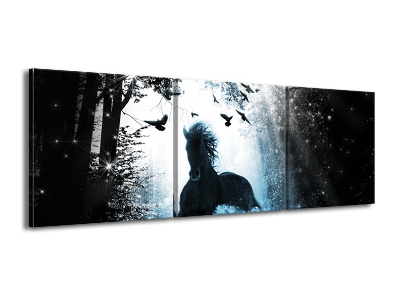Glasschilderij Paard, Dieren | Blauw, Zwart, Wit | 150x50cm 3Luik