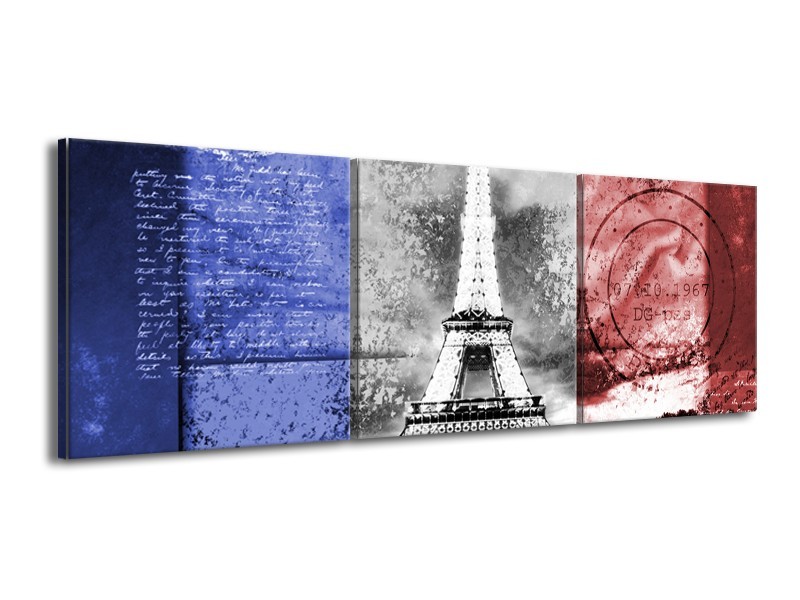Glasschilderij Parijs, Eiffeltoren | Blauw, Rood, Zwart | 150x50cm 3Luik