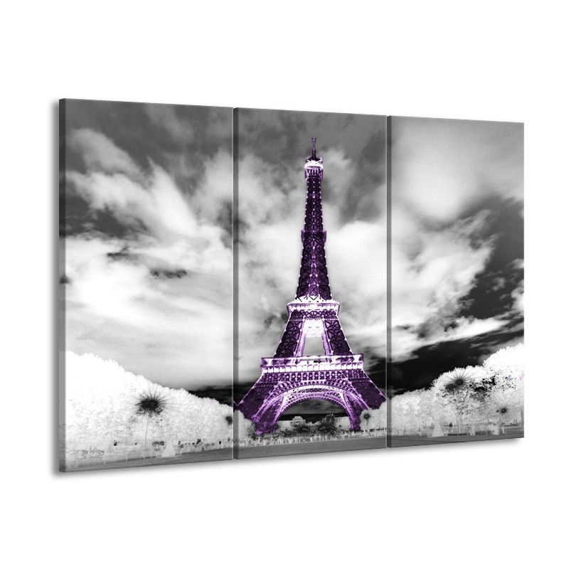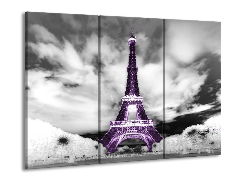 Glasschilderij Parijs, Eiffeltoren | Zwart, Wit, Paars | 60x90cm 3Luik