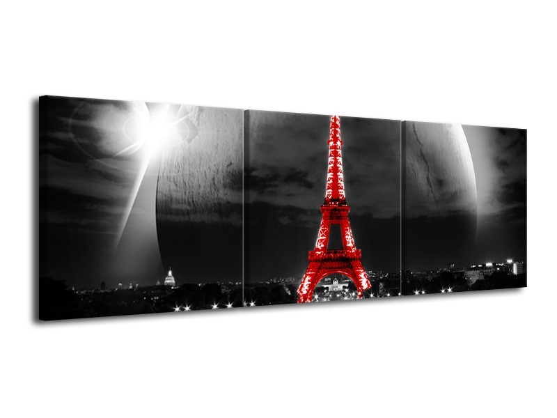 Glasschilderij Parijs, Eiffeltoren | Zwart, Wit, Rood | 120x40cm 3Luik