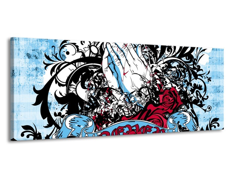 Glasschilderij Popart, Handen | Blauw, Rood, Zwart | 145x58cm 1Luik
