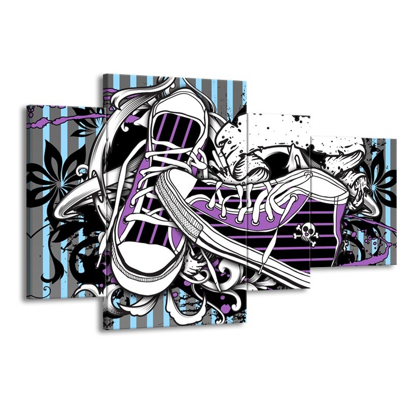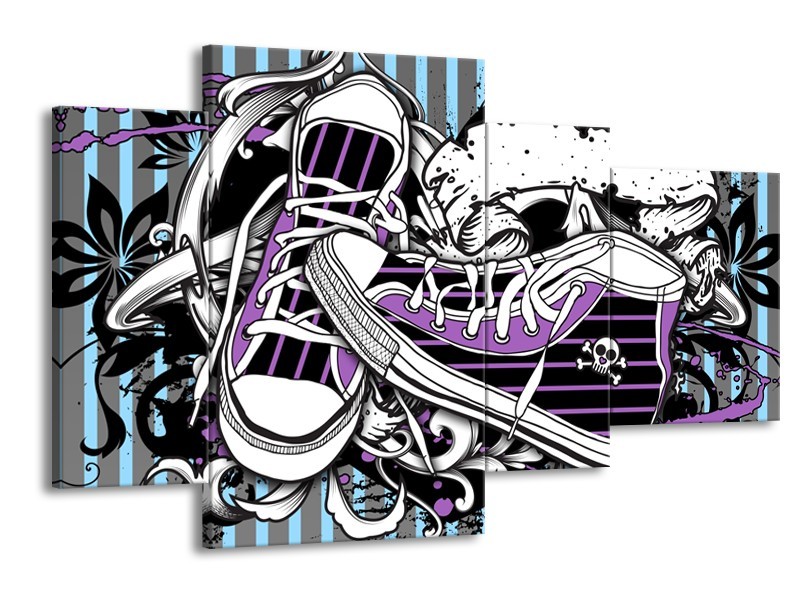 Glasschilderij Popart, Schoenen | Grijs, Paars, Wit | 120x75cm 4Luik