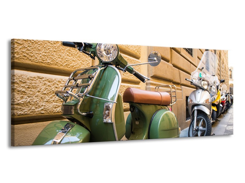 Glasschilderij Scooter, Motor | Groen, Bruin, Crème | 145x58cm 1Luik