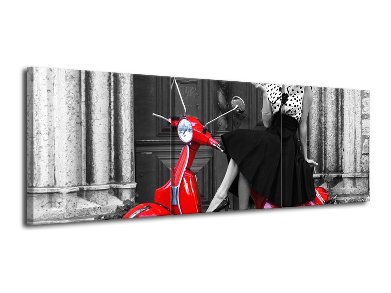 Glasschilderij Scooter, Vrouw | Zwart, Wit, Rood | 120x40cm 3Luik